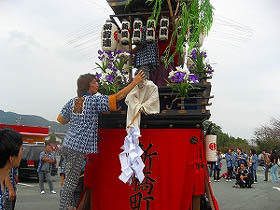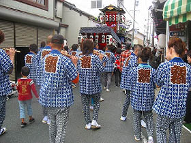 『二川八幡神社礼大祭』とは? 天保時代から約400年以上も続く歴史あるお祭で、『二川のお祭り』といえば、地元の人なら大体ピンと来ますが、正確には『二川八幡神社礼大祭』といいます。二川の3町内(新橋・中町・東町)がお囃子を奏でながら、山車と一緒に町を練り歩きます。その山車には独自の”からくり人形”ついており見所の一つとなっています。しかし山車はあくまで余興で、神事の部分は神輿をかつぎ、隊列を組んで町を練り歩く徒行があります。その中で小学校3年生が行う御神楽子があります。笛太鼓にあわせて、踊りを踊ります。 夜には山車に電飾を施し、昼間とはまた趣が違います。若連は神社の神様が男だからという理由でか(うわさでは)女装(基本は法被の代わりに肌じばん・・着物の下着をはおり、化粧をする)をしますが、近年では仮装をする若連もいます。また、若連がハンカチを撒き(写真では分かりにくいですが)それを拾うとその日一年ごりやくがあるとか。近年ではハンカチにも絵の入ったミニタオルだとか、餅やお菓子を撒く傾向があります。 『二川八幡神社礼大祭レポート』 実際に現地へ行ってきた感想を載せますので、現地にいかれる時の参考にして下さい。今回現地レポート担当31歳豊川市出身の地元の町では、このような山車をつかったお祭がないので、なんかいいな〜と思いました。実際に現地へ行ってきた感想を載せますので、現地にいかれる時の参考にして下さい。 <昼の部の様子〜>