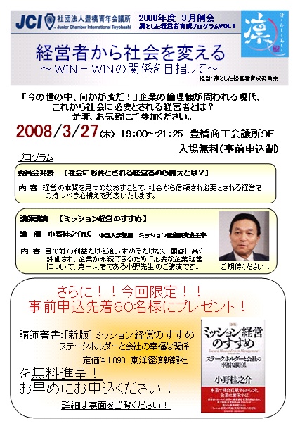2月例会「羽ばたけ 未来のリーダー 〜人の心と向かい合うために〜」 3月例会「経営者から社会を変える 〜WIN−WINの関係を目指して〜」 5月例会 東三河 真の自立フィーラム 〜道州制時代到来!?今、豊橋が果たすべき役割 そして近隣市町村と共に描く未来〜 6月例会 あなたの心は伝わっていますか!! 〜お互いの思いやりが社会をつくる〜 8月事業 〜懐かしい未来へ旅立とう森から始まる「おもやい」のこころ〜 9月例会 JC市民フォーラム〜みんなで考えよう、市民のしあわせ〜 9月事業 とよがわーるど2008 10月例会 オクトーバーフェスト2008 〜LOVE PORT TOWN とよはし〜 豊橋市長選挙立候補予定者公開討論会